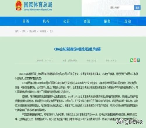 山东球员陶汉林在2016年10月30日国家体育总局反兴奋剂中心实施的赛内兴奋剂检查中,A样本检测结果呈蛋白同化制剂(克仑特罗)阳性。