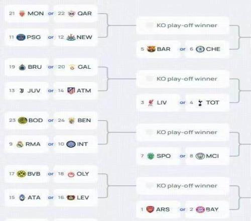 附加赛种子队(9-16名):皇家马德里、国际米兰、巴黎圣日耳曼、纽卡斯尔联、尤文图斯、马德里竞技、亚特兰大、勒沃库森